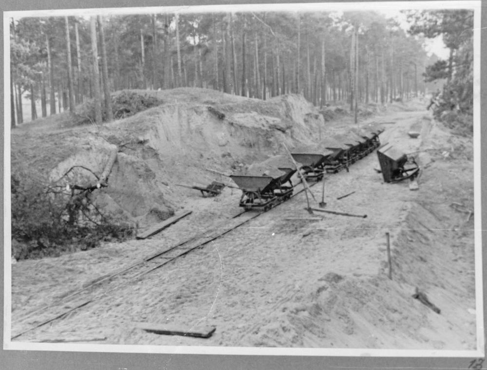 Ceļa būves darbi no Meža prospekta virzienā uz Dzirnupes staciju (Mangaļi), tagad Viestura prospekts Rīgā. Ceļu klātnes norakums gar paugura malu.