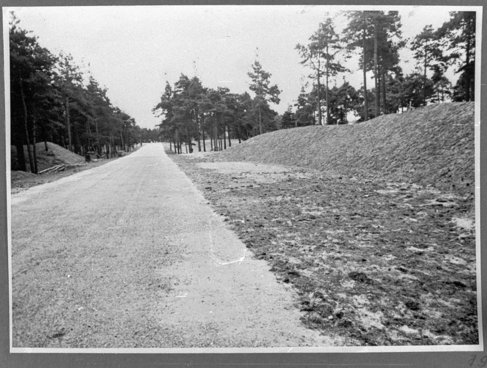 Ceļa būves darbi no Meža prospekta virzienā uz Dzirnupes staciju (Mangaļi), tagad Viestura prospekts Rīgā. Skats uz Meža prospektu pie ierakuma.