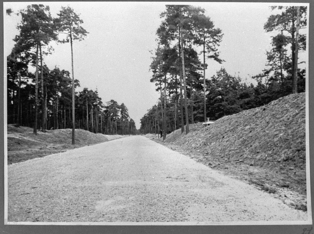Ceļa būves darbi no Meža prospekta virzienā uz Dzirnupes staciju (Mangaļi), tagad Viestura prospekts Rīgā. Skats uz ceļa atzarojuma pusi, kas ved uz A/S "Valdšleschens" (A/S "Aldaris").