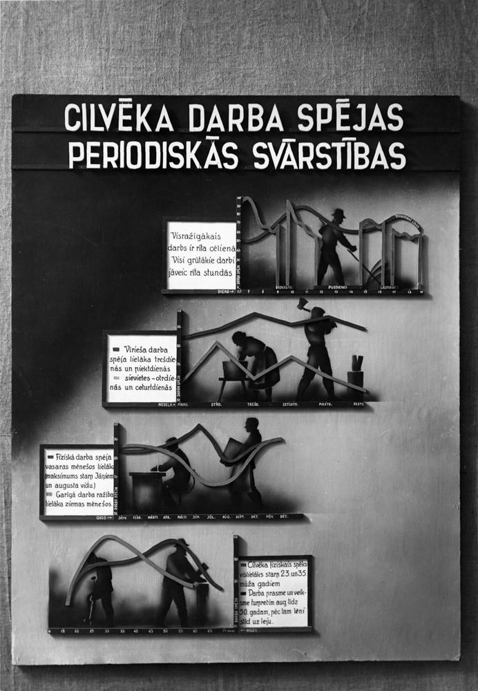 Veselības veicināšanas biedrības izstāde ''Darbs un atpūta'' no 1939. gada 18. marta līdz 3. aprīlim Kongresu un Amatu namos (Lielās ģildes un Mazās ģildes namos). Cilvēka darba spēju svārstības izskaidrojošs plakāts.