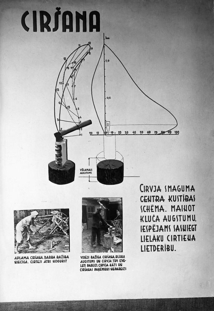 Veselības veicināšanas biedrības izstāde ''Darbs un atpūta'' no 1939. gada 18. marta līdz 3. aprīlim Kongresu un Amatu namos (Lielās ģildes un Mazās ģildes namos). Darba racionalizācijai veltīts plakāts - cirvja smaguma centra kustības shēma.