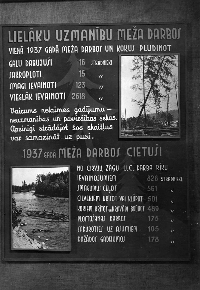Veselības veicināšanas biedrības izstāde ''Darbs un atpūta'' no 1939. gada 18. marta līdz 3. aprīlim Kongresu un Amatu namos (Lielās ģildes un Mazās ģildes namos). Plakāts, kas informē par 1937. gada nelaimes gadījumu statistiku mežsaimniecības nozarē.