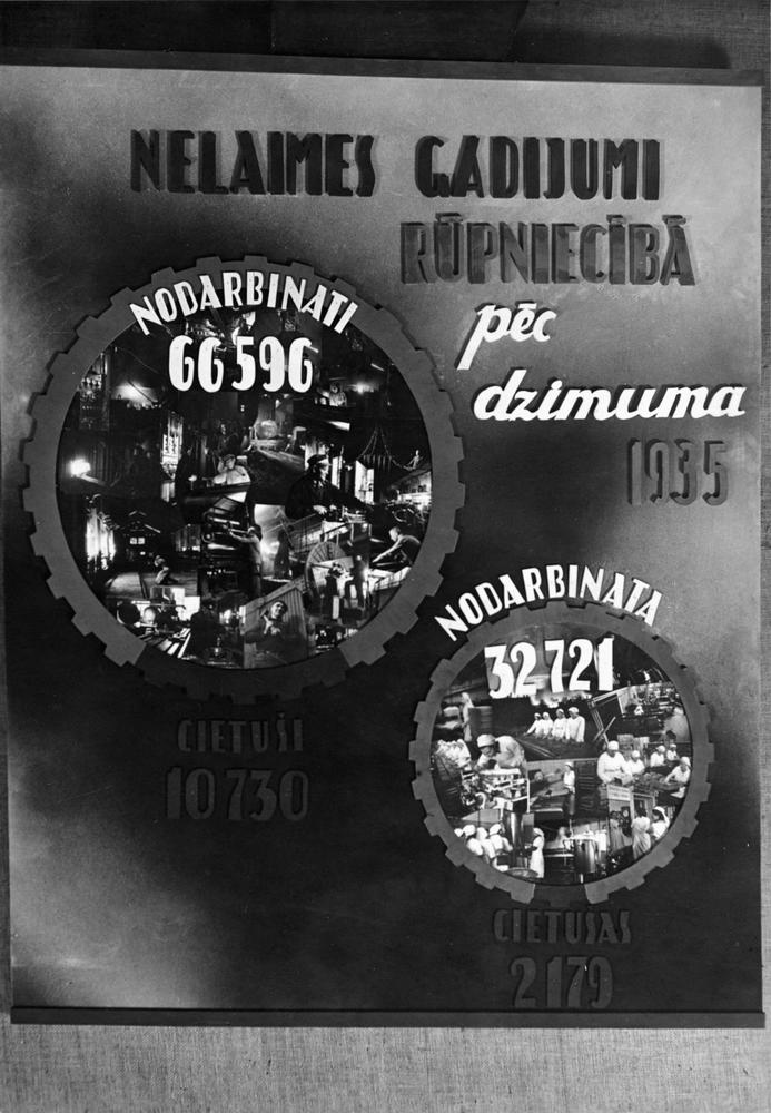 Veselības veicināšanas biedrības izstāde ''Darbs un atpūta'' no 1939. gada 18. marta līdz 3. aprīlim Kongresu un Amatu namos (Lielās ģildes un Mazās ģildes namos). Nelaimes gadījumiem rūpniecībā veltīts plakāts.