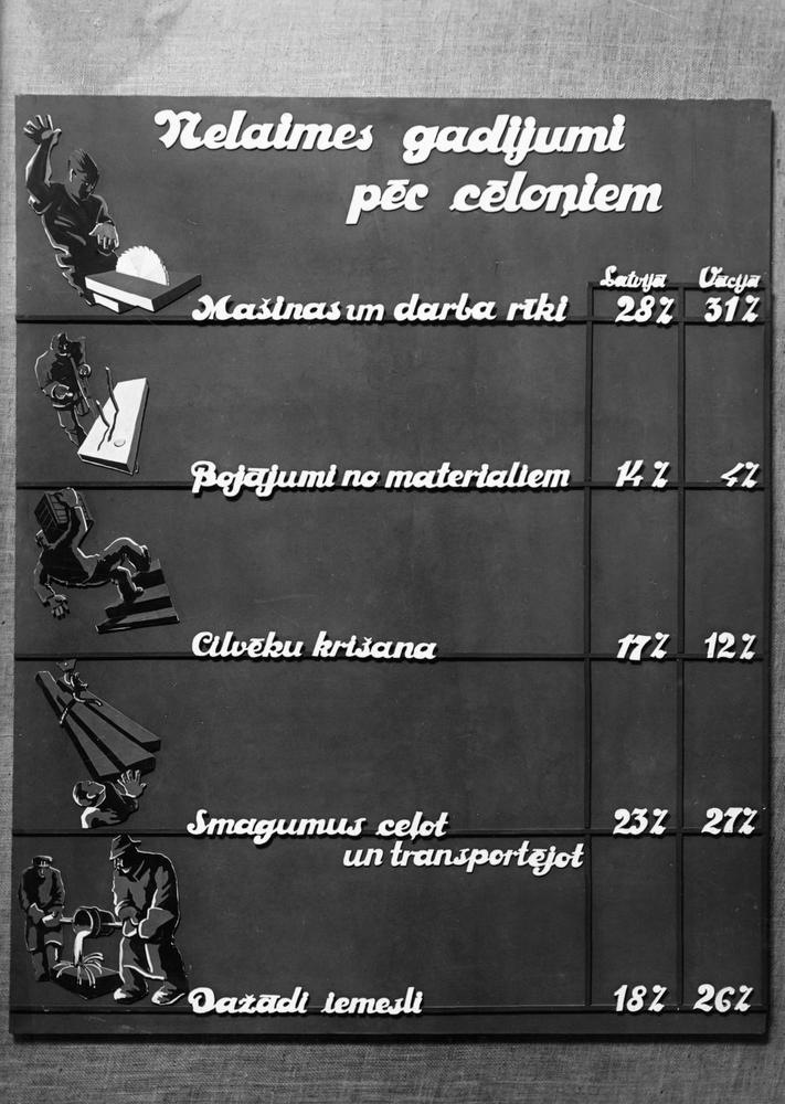 Veselības veicināšanas biedrības izstāde ''Darbs un atpūta'' no 1939. gada 18. marta līdz 3. aprīlim Kongresu un Amatu namos (Lielās ģildes un Mazās ģildes namos). Nelaimes gadījumiem rūpniecībā veltīts plakāts.