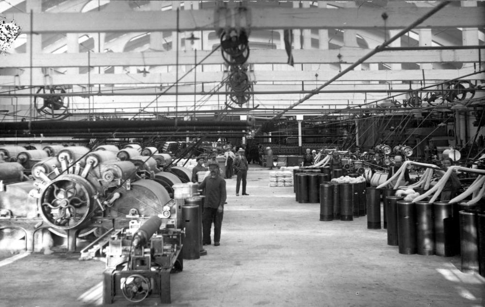 Akciju sabiedrības ''Rīgas tekstilfabrika'' ("Tekstils") angļu vērptuves iekšskats Baltāsmuižas ielā (tagad Baltajā ielā 3/9). Vērptuvē uzstādītas krempeļa un kāršamās mašīnas ''Noble Comb''.