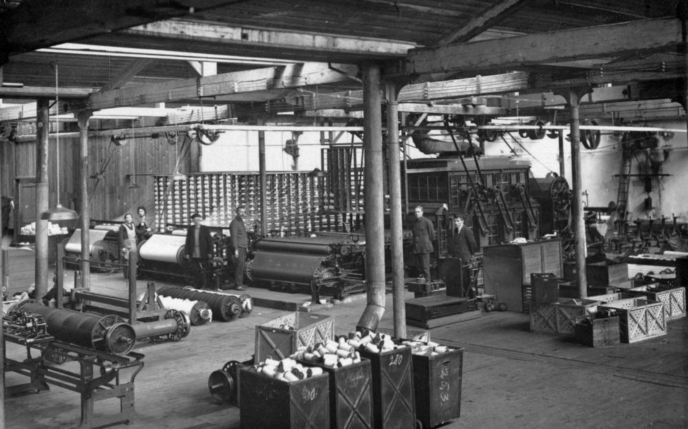 Akciju sabiedrības ''Rīgas tekstilfabrika'' ("Tekstils") metu šķērētavas un līmētavas iekšskats Baltāsmuižas ielā (tagad Baltajā ielā 3/9).