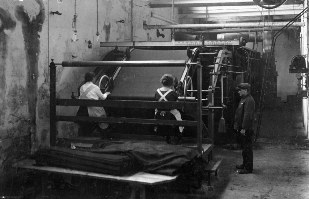 Akciju sabiedrības ''Rīgas tekstilfabrika'' ("Tekstils") fabrikas Baltāsmuižas ielā (tagad Baltajā ielā 3/9) iekšskats. Fotogrāfijas centrā atrodas žāvējamā mašīna.