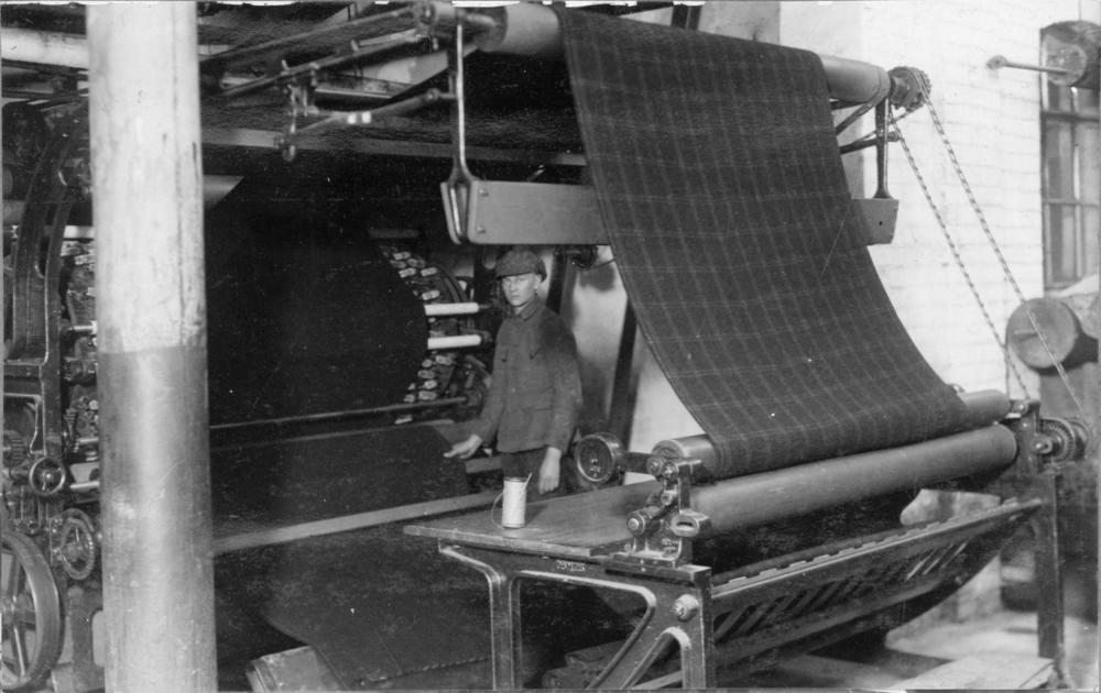 Akciju sabiedrības ''Rīgas tekstilfabrika'' ("Tekstils") fabrikas Baltāsmuižas ielā (tagad Baltajā ielā 3/9) iekšskats. Fotogrāfijas centrā atrodas uzkārstuve.