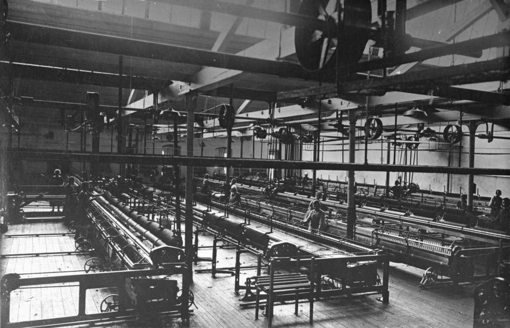 Akciju sabiedrības ''Rīgas tekstilfabrika'' ("Tekstils") vācu vērptuves iekšskats Baltāsmuižas ielā (tagad Baltajā ielā 3/9). Vācu vērptuvē uzstādīti zelfaktori.