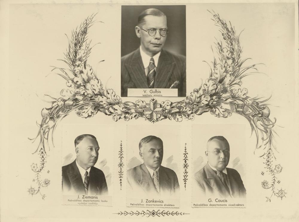 Latvijas Valsts Iekšlietu ministrijas darbinieku portretu montāža.1. rindā: Iekšlietu ministrs Vilis Gustavs Gulbis. 2. rindā no kreisās: 1. Iekšlietu ministrijas Pašvaldības departamenta Lauku pašvaldības nodaļas vadītājs Jānis Ziemanis, 2. Iekšlietu ministrijas Pašvaldības departamenta direktors Juris Zankevics, 3. Iekšlietu ministrijas Pašvaldības departamenta direktora vietnieks Gothards Caucis.