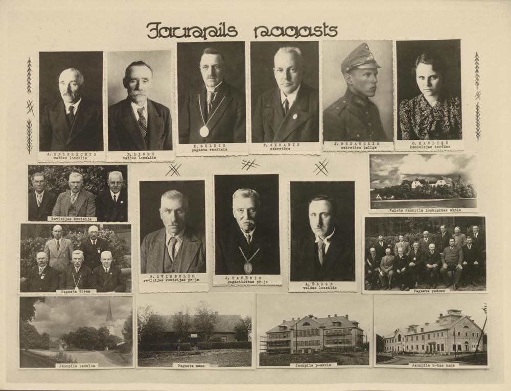 Tukuma apriņķa Jaunpils pagasta pašvaldības darbinieki. 1. rindā no kreisās: 1. valdes loceklis A. Helfrecehts, 2. valdes loceklis F. Linde, 3. pagasta vecākais Kārlis Gulbis, 4. sekretārs Fricis Skrabis, 5. sekretāra palīgs J. Rezauskis, 6. kancelejas ierēdne O. Kauliņa. 2. rindā no kreisās: 1. revīzijas komisijas locekļu kopbilde (augšā), 2. pagasta tiess locekļu kopbilde (apakšā), 3. revīzijas komisijas priekšsēdētājs F. Zvirbulis, 4. pagasttiesas priekšsēdētājs J. Pavēnis, 4. valdes loceklis A. Šlage, 5. Jaunpils lopkopības skolas ēka (augšā), 6. pagasta padomes locekļu kopbilde (apakšā). 3. rindā no kreisās: 1. Jaunpils evaņģēliski luteriskā baznīca, 2. pagasta valdes nams, 3. Jaunpils pamatskolas ēka, 4. Jaunpils biedrības nams. Fotomontāža.