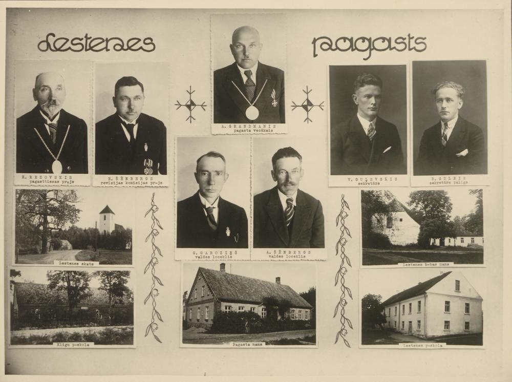 Tukuma apriņķa Lestenes pagasta pašvaldības darbinieki. 1. rindā no kreisās: 1. pagasttiesas priekšsēdētājs K. Rezovskis, 2. revīzijas komisijas priekšsēdētājs E. Šēnbergs, 3. pagasta vecākais Alfrēds Grandmanis, 4. sekretārs Vilhelms Guļevskis, 3. sekretāra palīgs R. Gulbis. 2. rindā no kreisās: 1. Lestenes evaņģēliski luteriskā baznīca, 2. valdes loceklis G. Garoziņš, 3. valdes loceklis A. Šēnbergs, 4. Lestenes biedrības nams. 3. rindā no kreisās: 1. Kliģu pamatskolas ēka, 2. pagasta valdes nams, 3. Lestenes pamatskolas ēka. Fotomontāža.
