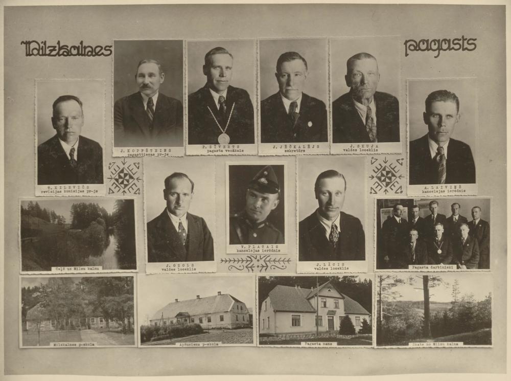 Tukuma apriņķa Milzkalnes pagasta pašvaldības darbinieki. 1. rindā no kreisās: 1. revīzijas komisijas priekšsēdētājs T. Kilevičs, 2. pagasttiesas priekšsēdētājs J. Kopfšteins, 3. pagasta vecākais Paulis Zīverts, 4. sekretārs Jānis Jēčkalējs, 5. valdes loceklis J. Skuja, 6. kancelejas ierēdnis A. Laiviņš. 2. rindā no kreisās: 1. ainava ar ceļu uz Milzkalnu, 2. valdes loceklis J. Ozols, 3. Kancelejas ierēdnis V. Platais, 4. valdes loceklis J. Lācis, 5. pagasta valdes darbinieku kopbilde. 3. rindā no kreisās: 1. Milzkalnes pamatskolas ēka, 2. Apšuciema pamatskolas ēka, 3. pagasta valdes nams, 4. lauku ainava veroties no Milzkalna. Fotomontāža.