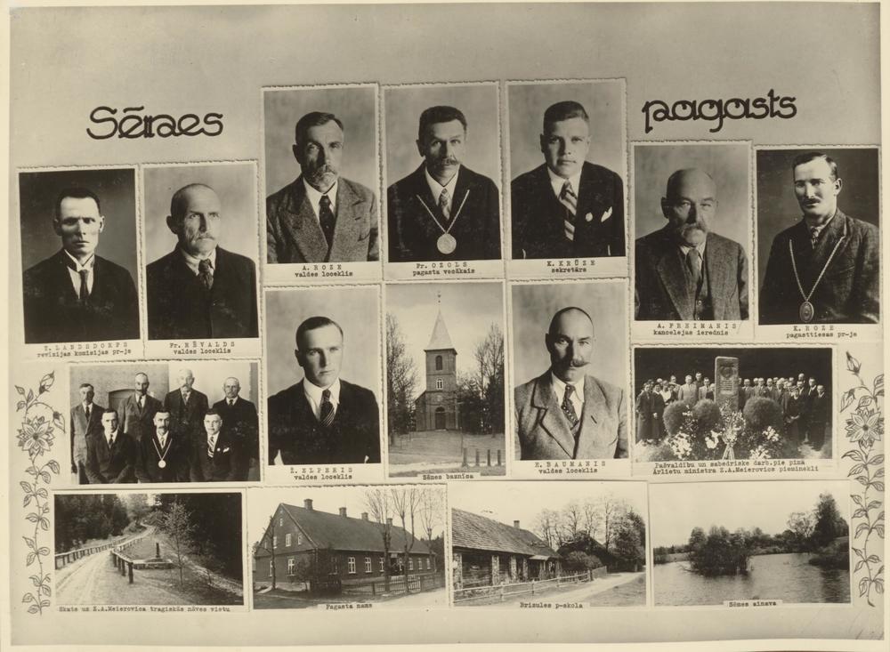 2. rindā no kreisās: 1. pagasta valdes darbinieku kopbilde, 2. valdes loceklis Ž. Elperis, 3. Sēmes evaņģēliski luteriskā baznīca, 4. valdes loceklis E. Baumanis, 5. pašvaldības un sabiedrisko darbinieku kopbilde pie pirmā Ārlietu ministra Zigfrīda Annas Meierovica pieminekļa. 3. rindā no kreisās: 1. skats uz ceļa posmu kur gāja bojā Zigfrīds Annas Meierovics, 2. pagasta valdes nams, 3. Brizules pamatskolas ēka, 4. Sēmes upe. Fotomontāža.