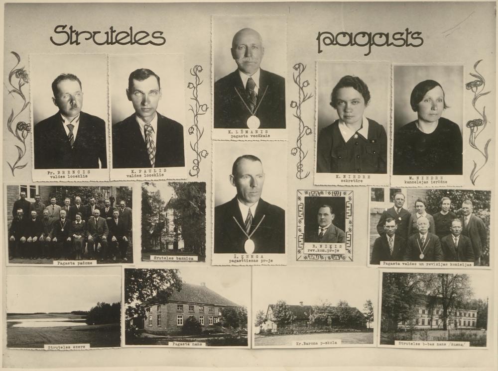 Tukuma apriņķa Struteles pagasta pašvaldības darbinieki. 1. rindā no kreisās: 1. valdes loceklis Fr. Brencis, 2. valdes loceklis K. Paulis, 3. pagasta vecākais Kārlis Lēmanis, 4. sekretāre Katrīne Niedre, 5. kancelejas ierēdne M. Niedre. 2. rindā no kreisās: 1. pagasta padomes darbinieku kopbilde, 2. Struteles evaņģēliski luteriskā baznīca, 3. pagasttiesas priekšsēdētājs Ā. Ķenga, 4. revīzijas komisijas priekšsēdētājs B. Niķis, 5. pagasta valdes un revīzijas komisijas darbinieku kopbilde. 3. rindā no kreisās: 1. Struteles ezers, 2. pagasta valdes nams, 3. Krišjāņa Barona pamatskolas ēka, 4. Struteles biedrības nams "Ausma". Fotomontāža.