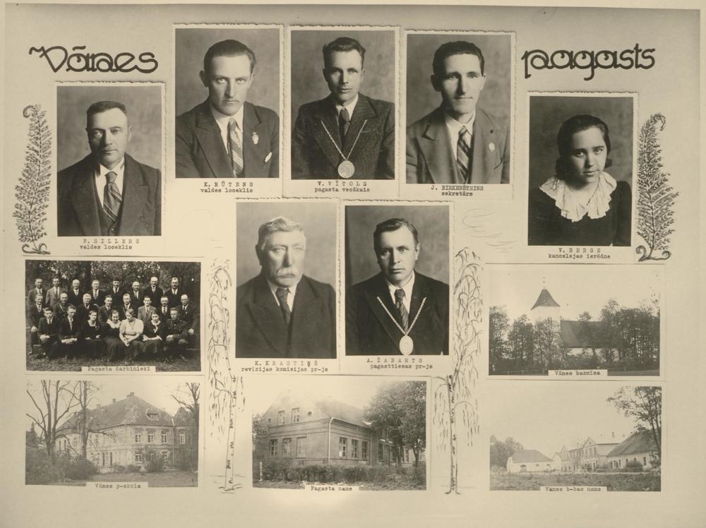 Tukuma apriņķa Vānes pagasta pašvaldības darbinieki. 1. rindā no kreisās: 1. valdes loceklis F. Sillers, 2. valdes loceklis K. Rūtens, 3. pagasta vecākais Valters Vītols, 4. sekretārs Jēkabs Birkenšteins, 5. kancelejas ierēdne V. Bergs. 2. rindā no kreisās: 1. pagasta darbinieku kopbilde, 2. revīzijas komisijas priekšsēdētājs K. Krastiņš, 3. pagasttiesas priekšsēdētājs A. Žabarts, 4. Vānes evaņģēliski luteriskā baznīca. 3. rindā no kreisās: 1. Vānes pamatskolas ēka, 2. pagasta valdes nams, 3. Vānes biedrības nams. Fotomontāža.