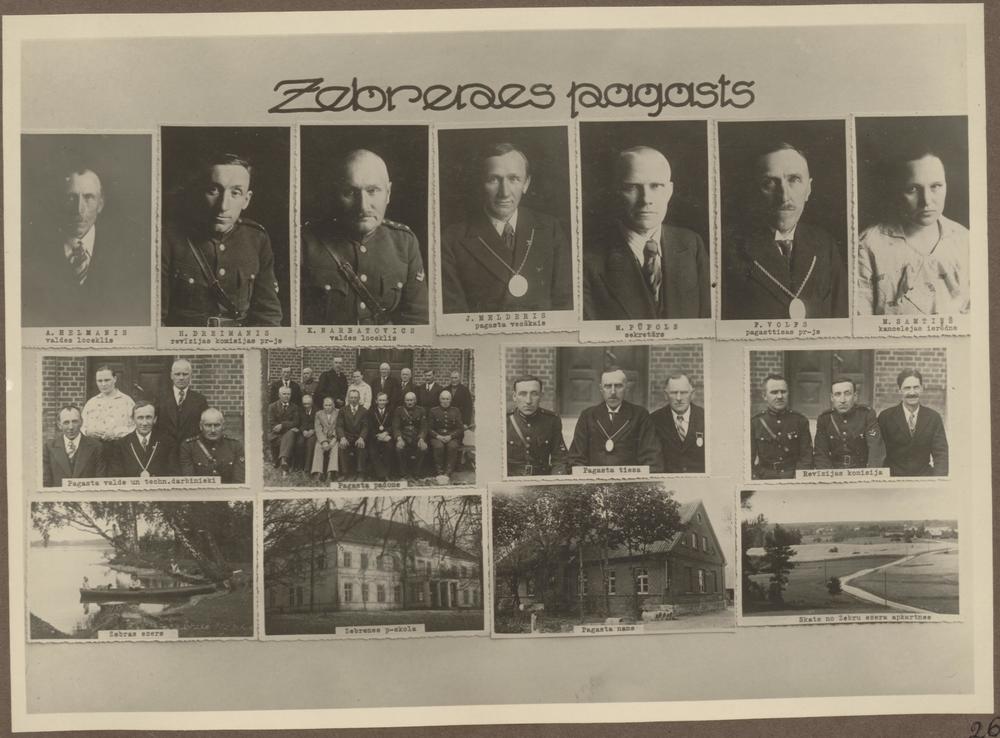 Tukuma apriņķa Zebrenes pagasta pašvaldības darbinieki. 1. rindā no kreisās: 1. valdes loceklis A. Helmanis, 2. revīzijas komisijas priekšsēdētājs H. Dreimanis, 3. valdes loceklis K. Narbatovics, 4. pagasta vecākais Jānis Melderis, 5. sekretārs Matīss Pūpols, 6. pagasttiesas priekšsēdētājs F. Volfs, 7. kancelejas ierēdne M. Samtiņš. 2. rindā no kreisās: 1. pagasta valdes un tehnisko darbinieku kopbilde, 2. pagasta padomes darbinieku kopbilde, 3. pagasta tiesas locekļu kopbilde, 4. revīzijas komisijas locekļu kopbilde. 3. rindā no kreisās: 1. Zebras ezers, 2. Zebrenes pamatskolas ēka, 3. pagasta valdes nams, 4. skats uz Zebru ezera. Fotomontāža.