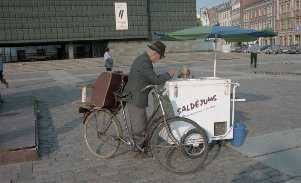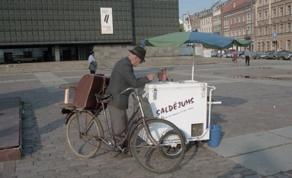 Veģetārietis. Ielu muzikants pērk saldējumu.