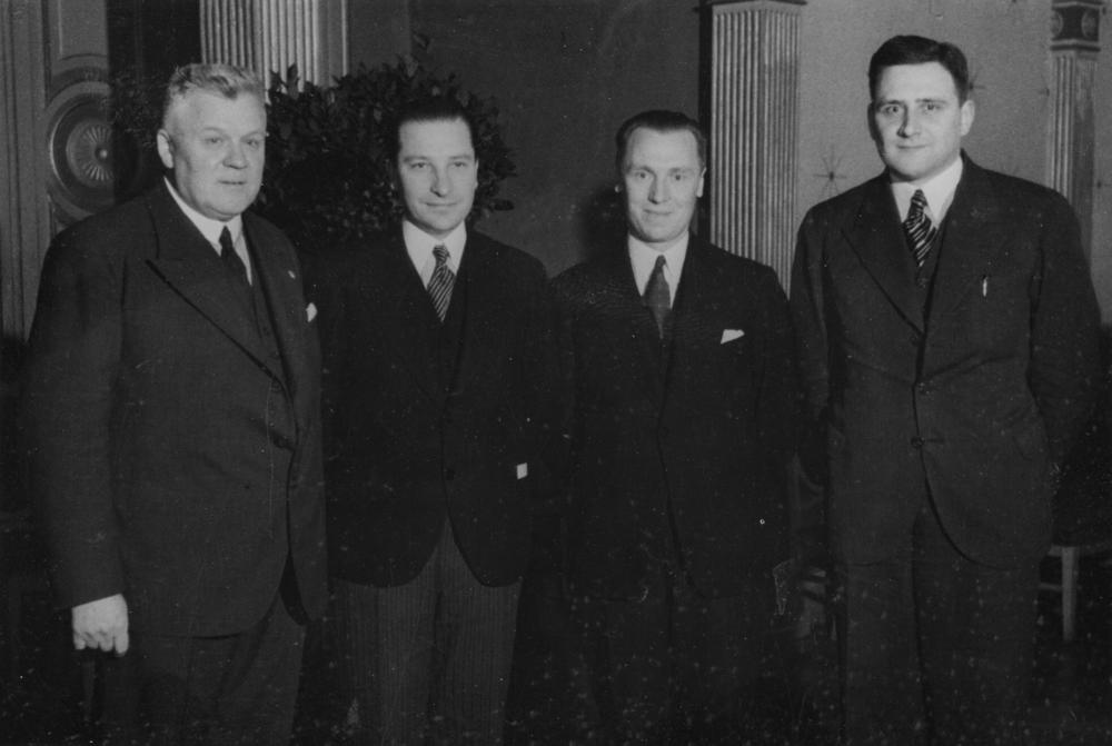 Latvijas Valsts un Ministru prezidenta Kārļa Ulmaņa un preses pārstāvju sanāksme. No kreisās: 1. Kārlis Ulmanis, 2. iekšlietu ministra biedrs Alfrēds Bērziņš.