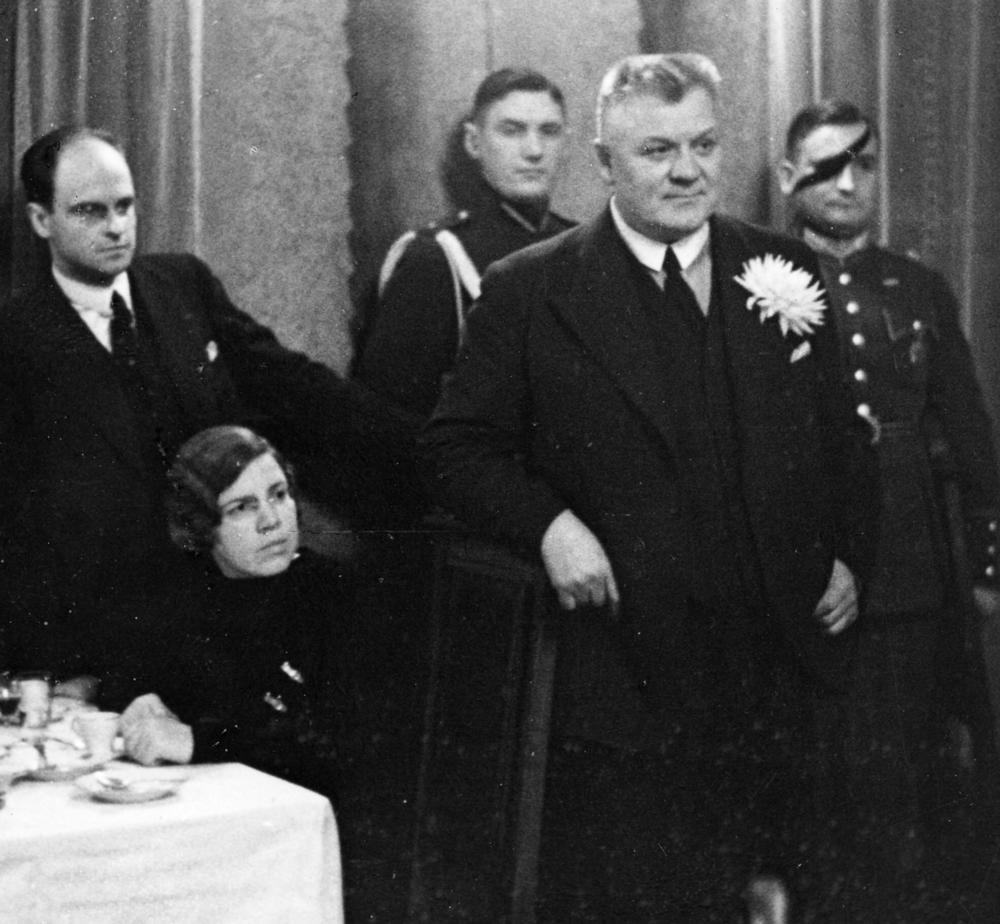 Latvijas Valsts un Ministru prezidenta Kārļa Ulmaņa un preses pārstāvju sanāksme. Priekšplānā no kreisās: 1. laikraksta "Brīvā Zeme" lauku nodaļas vadītājs (1933-1940, redakcijā no 1927. gada), žurnāla "Sievietes Pasaule" redakcijas darbiniece (1932-1936), žurnāla "Mazpulks" literārās nodaļas redaktore (1933 -1940), rakstniece Ausma Roga (arī Rasma Roga, Būmerte, Bērzāja, dzimusi Anna Ēvelīte), 2. Kārlis Ulmanis. Fonā žurnāla "Aizsargs" kolēģijas darbinieks kā Kara ministrijas pārstāvis (1932-1935), žurnāla "Militārais Apskats" darbinieks, rakstnieks, pulkvežleitnants Edvīns Mednis (komponista Emiļa Melngaiļa māsas dēls, Aleksandra Grīna romāna "Dvēseļu putenis" persona).
