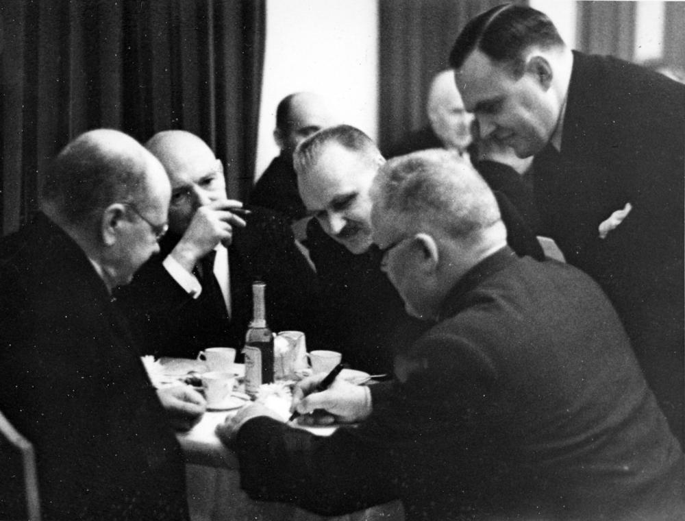 Latvijas Valsts un Ministru prezidenta Kārļa Ulmaņa un preses pārstāvju sanāksme. Ap galdu no kreisās: 1. Somijas ārkārtējais sūtnis un pilnvarotais ministrs Latvijas Republikā Eduards Jalmars Palins, 2. Latvijas Universitātes Mežu tehnoloģijas katedras vadītājs (1922-1939), profesors Arvīds Kalniņš, 5. Kārlis Ulmanis.