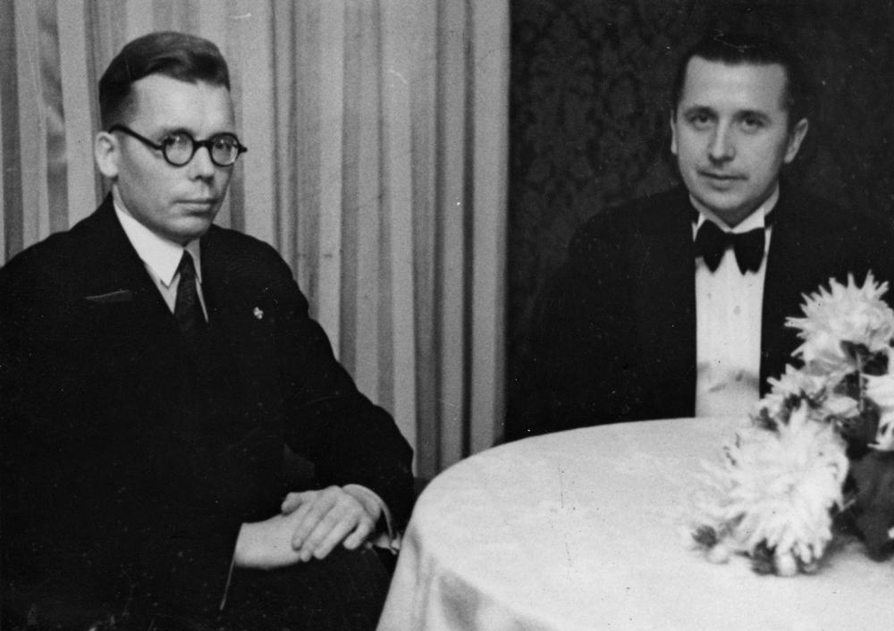 Latvijas Valsts un Ministru prezidenta Kārļa Ulmaņa un preses pārstāvju sanāksme. No kreisās: 1. Ārlietu ministrijas Preses nodaļas vadītājs Arnolds Pēteris Skrēbers, 2. izdevējs un izdevniecības "Grāmatu draugs" īpašnieks (piegādājis grāmatas caur laikrakstu "Jaunākās ziņas") Helmārs Rudzītis.