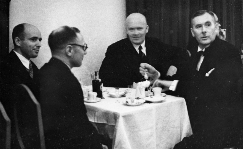 Latvijas Valsts un Ministru prezidenta Kārļa Ulmaņa un preses pārstāvju sanāksme. Ap galdu no kreisās: 1. dzejnieks un pasta ierēdnis (līdz 1936. gadam) Ēriks Osvalds Raisters (laikraksta "Rīts" redaktors (1936-1938)), 4. Latvijas Universitātes docents un Vecauces saimniecības prakses vadītājs Pāvils Kreišmanis (pēc 1940. gada Kvelde).