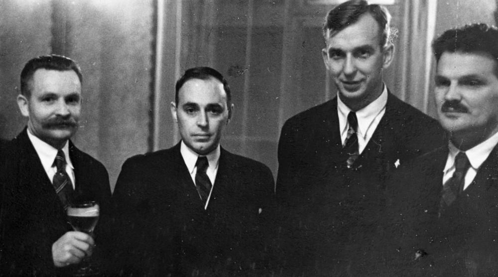 Latvijas Valsts un Ministru prezidenta Kārļa Ulmaņa un preses pārstāvju sanāksme. No kreisās: 1. Latvijas radiofona literāras daļas vadītājs, skolotājs Atis Zālītis, 2. laikraksta "Segodņa" žurnālists Edgars Mahtuss, 3. laikraksta "Rīts" ārlietu redaktors (1934-1940), rakstnieks Voldemārs Strautmanis (dzimtais vārds Arturs Teodors Strautmanis, pseidonīms Teodors Kaiga un Cibiņš, Sa, ts, Cb).