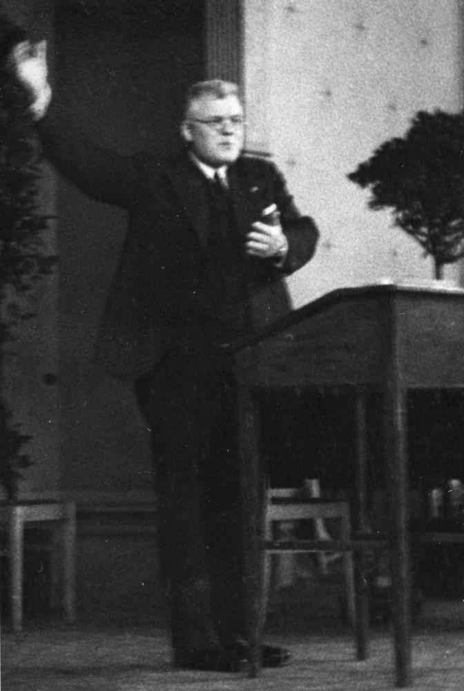 Latvijas Valsts un Ministru prezidents Kārlis Ulmanis uzstājas tribīnē, apspriedes laikā ar preses pārstāvjiem.