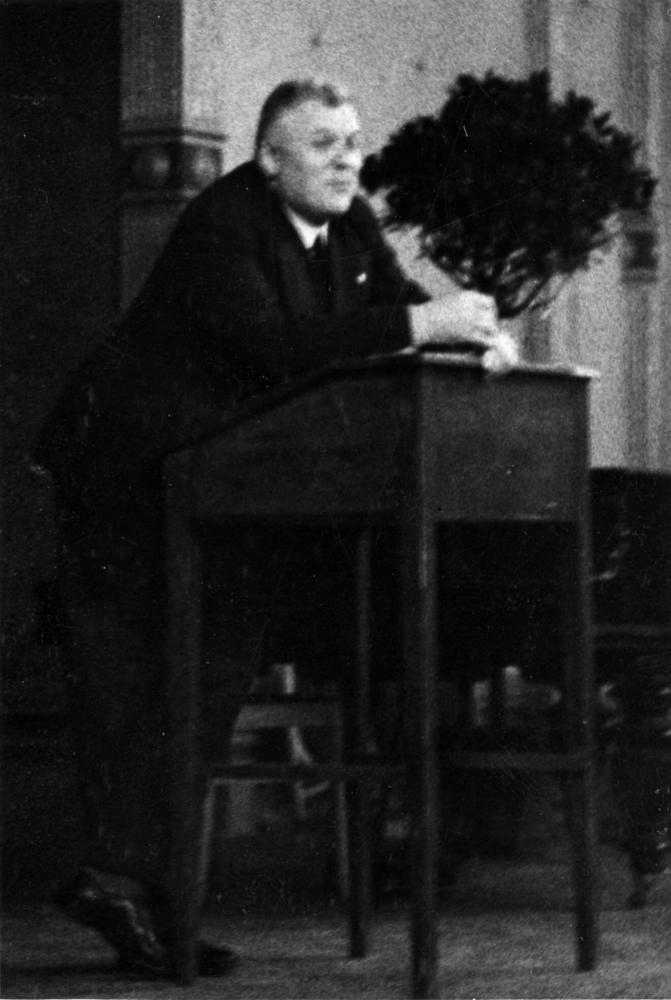 Latvijas Valsts un Ministru prezidents Kārlis Ulmanis uzstājas tribīnē, apspriedes laikā ar preses pārstāvjiem.