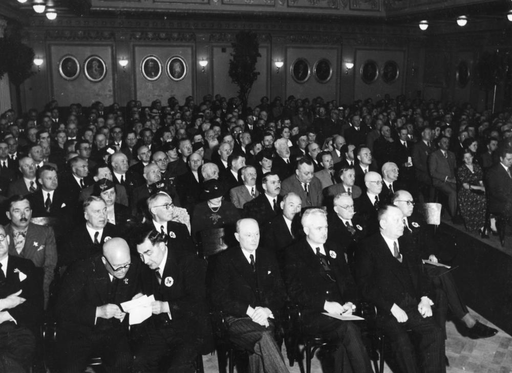 Skats uz Rīgas Latviešu biedrības nama lielo zāli 1938. gada 16. jūnijā 4. Igauņu, latviešu un lietuviešu sadarbības kongresa un "Baltijas nedēļas" svinīgā atklāšanas pasākuma (akta) laikā.
