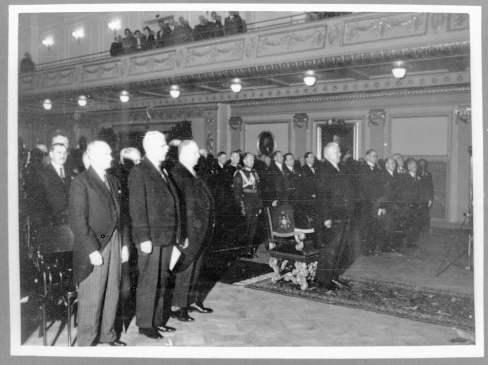 Rīgas Latviešu biedrības nama lielajā zālē 1938. gada 16. jūnijā 4. Igauņu, latviešu un lietuviešu sadarbības kongresa un "Baltijas nedēļas" svinīgā atklāšanas pasākuma (akta) laikā svinību dalībnieki stāv kājās. Kongresa atklāšanas pasākumā koris "Dziesmu vara" diriģenta Ādolfa Ābeles vadībā dziedāja Latvijas, Igaunijas un Lietuvas Valstu himnas. 1. rindā centrā Latvijas Valsts prezidents Kārlis Ulmanis.