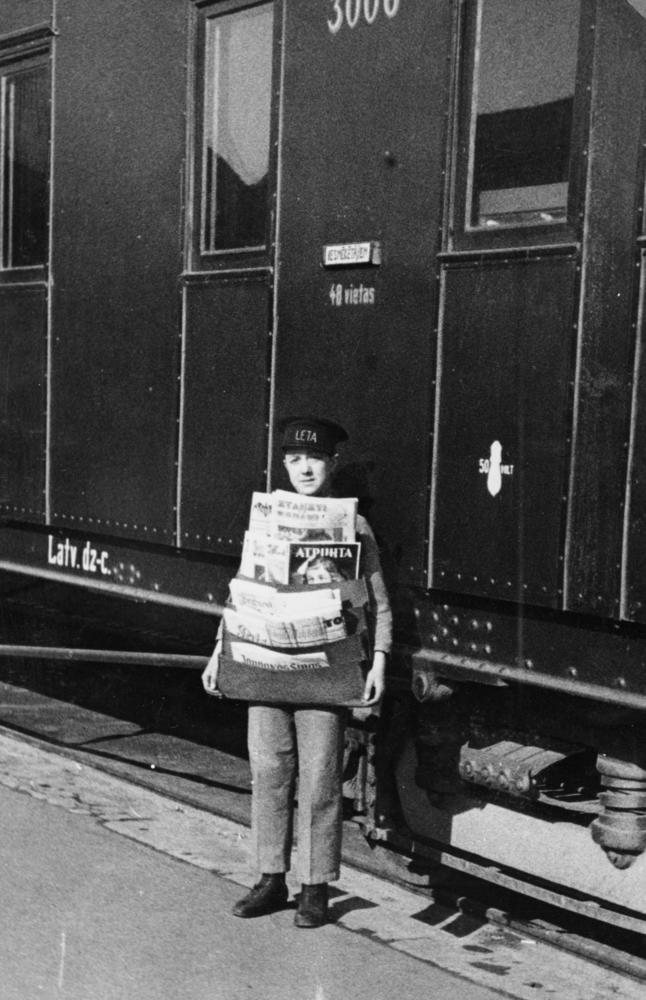 Latvijas Telegrāfa aģentūras (LETA) avīžu zēns, kas tirgojas dzelzceļa stacijā.