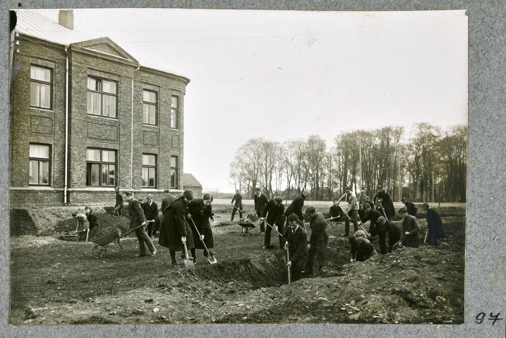 Jēkabpils Valsts vidusskolas skolēni ar lāpstām izlīdzina zemi ap skolu.