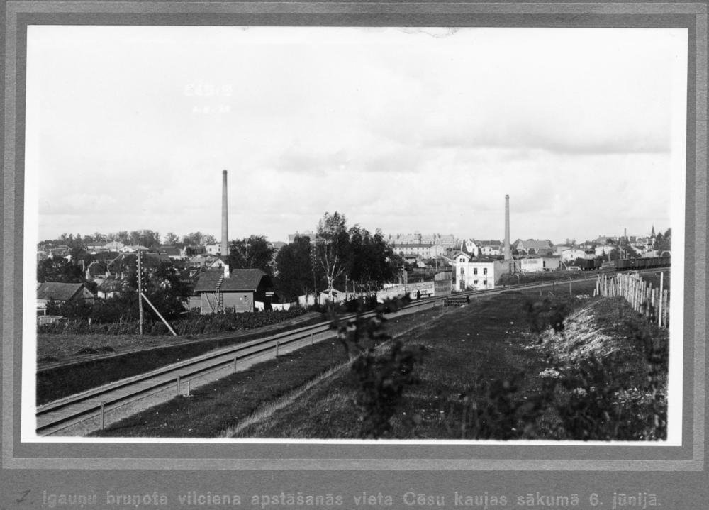 Dzelzceļš Cēsīs. Vieta, kur apstājās igauņu bruņotais vilciens Cēsu kauju sākumā, 1919. gada 6. jūnijā.
