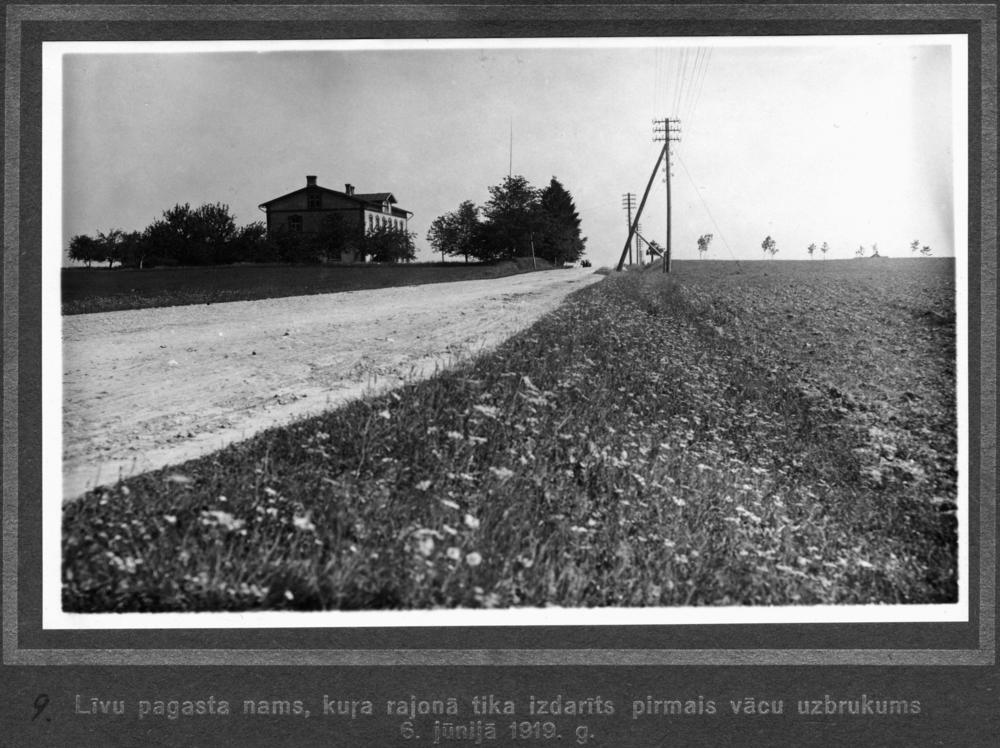 Līvu pagasta nams, kura tuvumā tika veikts pirmais vācu uzbrukums 1919. gada 6. jūnijā.