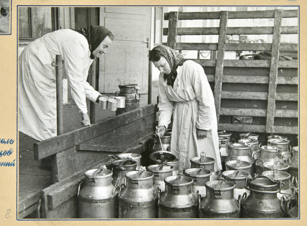 Rīgas Centrālā kolhozu tirgus (Rīgas Centrāltirgus) darbinieces no piena kannām ņem piena paraugus piena kontroles laboratorijas izmeklējumiem.