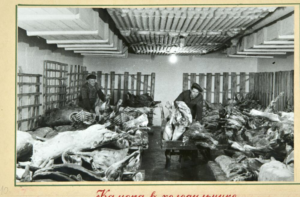 Rīgas Centrālais kolhozu tirgus (Rīgas Centrāltirgus). Gaļas saldētavas kameras iekšskats, saldētavas darbinieki krauj lopu kautķermeņus.