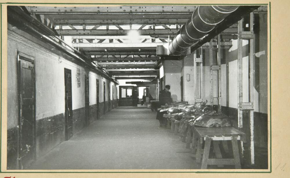 Rīgas Centrālais kolhozu tirgus (Rīgas Centrāltirgus). Skats uz tirgus saldētavas gaiteni, pa kreisi durvis uz saldētavas kamerām.