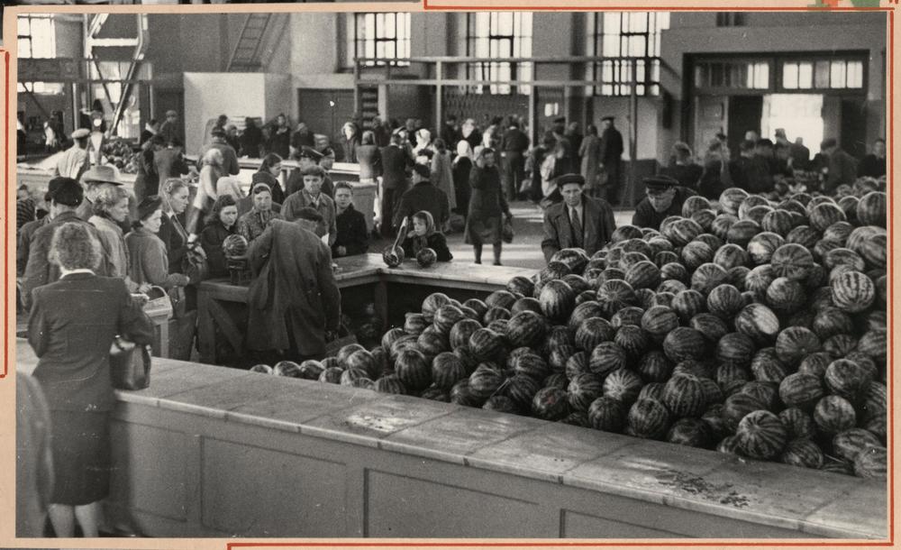 Rīgas Centrālais kolhozu tirgus (Rīgas Centrāltirgus). Kopējā paviljona iekšskats, pie arbūzu tirdzniecības vietas kaudzē sakrauti arbūzi.