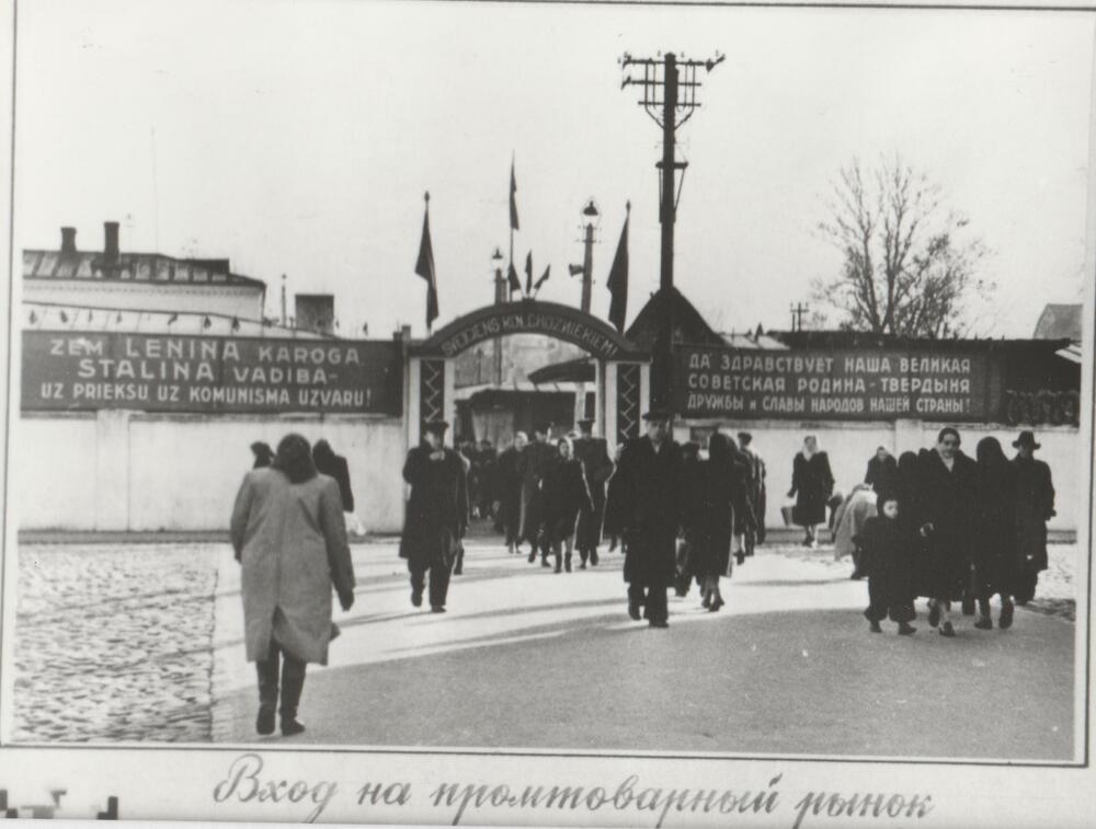 Rīgas Centrālā kolhozu tirgus (Rīgas Centrāltirgus) Rūpniecības preču tirgus ieejas vārti. Pie sētas plakāts ar uzrakstu "Zem Ļeņina karoga Staļina vadībā uz priekšu, uz komunisma uzvaru!".
