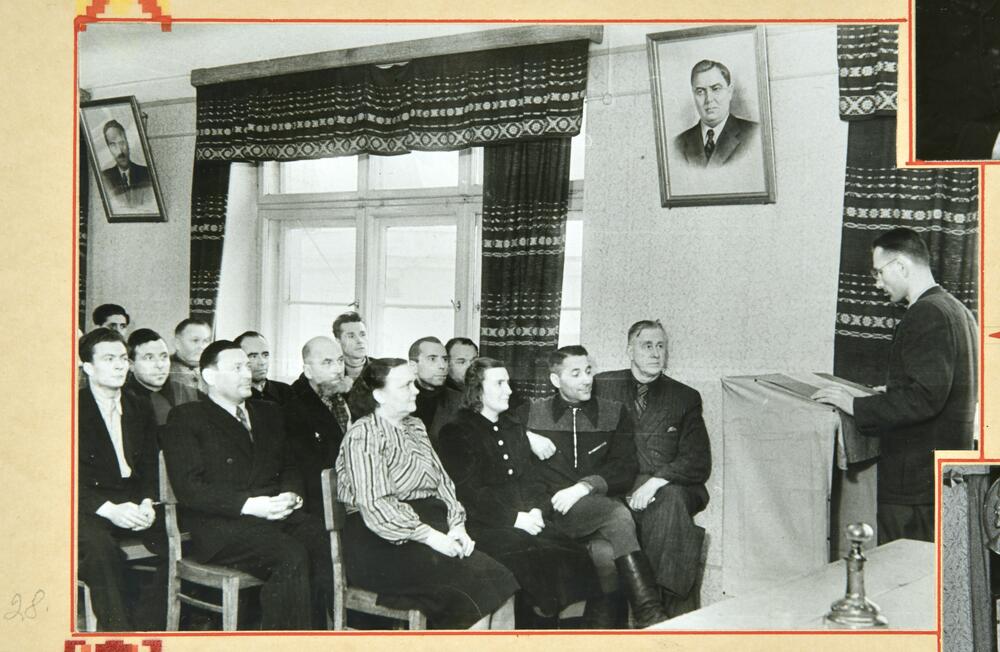 Rīgas Centrālais kolhozu tirgus (Rīgas Centrāltirgus), Latvijas Komunistiskās partijas (LKP) pirmorganizācijas sapulce tirgus "sarkanajā stūrītī". Grupas foto.