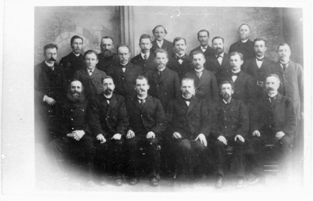 Pirmie latviešu zemnieku kopdarbības organizatori Vidzemes jeb Līvlandes guberņā 19. gadsimta beigās. Foto no nacionālās izstādes Rīgā 1936. gada maijā "Apceļo dzimto zemi!" Valmieras novietnes. Grupas foto.
