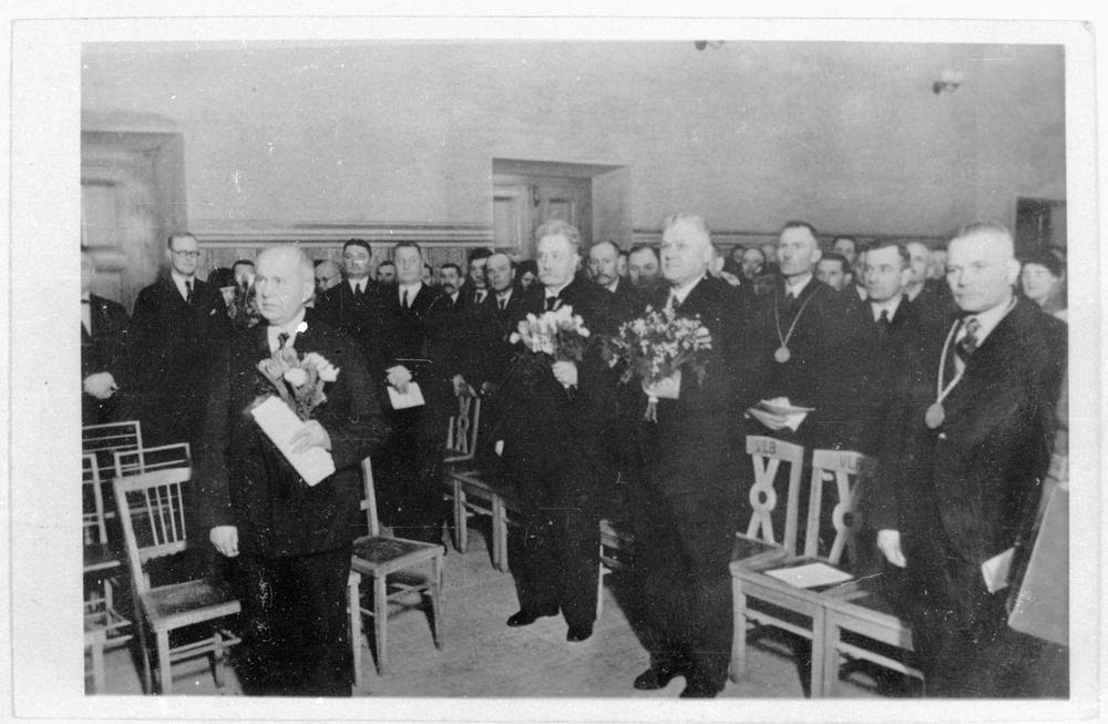 15. Zemnieku dienas Valmieras Latviešu biedrībā (?) 1.rindā no labās: 2. Latvijas Valsts un Ministru prezidents Kārlis Ulmanis, 3. Izglītības ministrs Augusts Tentelis.