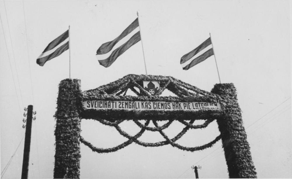 Goda vārti par godu Krustpils-Jēkabpils dzelzceļa tilta atklāšanai 1936. gada 16. novembrī. 1944. gada augustā tilts ticis uzspridzināts.