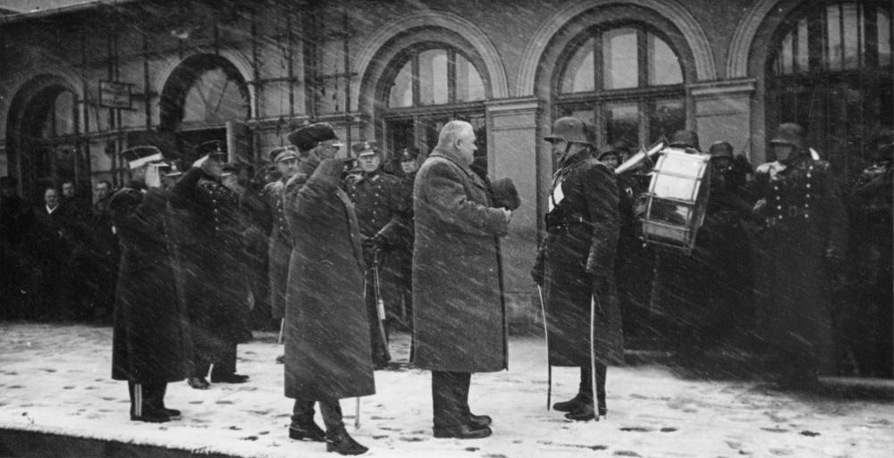 Latvijas Valsts un Ministru prezidentu Kārli Ulmani Krustpils-Jēkabpils dzelzceļa tilta atklāšanas pasākumā uz Krustpils stacijas perona sveic Latvijas armijas ģenerālis, Latgales divīzijas komandieris Andrejs Krūmiņš un Latvijas armijas pulkvedis, Latgales artilērijas pulka komandieris Jānis Žīds.