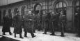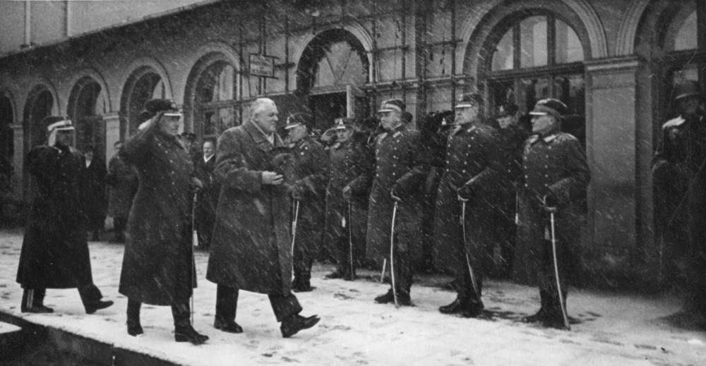 Krustpils-Jēkabpils dzelzceļa tilta atklāšanas pasākums. Latvijas Valsts un Ministru prezidents Kārlis Ulmanis apstaigā Latgales artilērijas pulka goda sardzes ierindu pie Krustpils dzelzceļa stacijas.