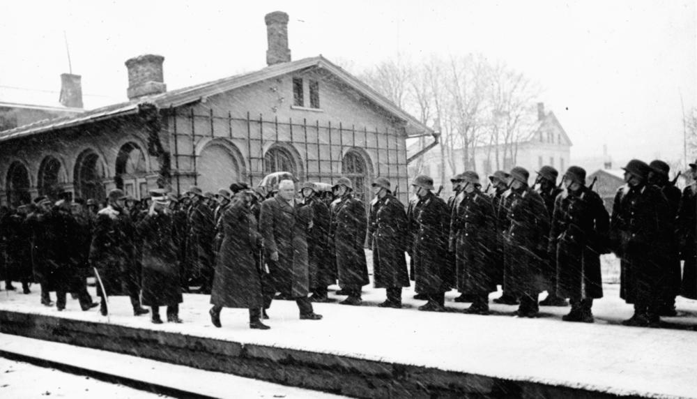 Krustpils-Jēkabpils dzelzceļa tilta atklāšanas pasākums. Latvijas Valsts un Ministru prezidents Kārlis Ulmanis apstaigā Latgales artilērijas pulka goda sardzes ierindu pie Krustpils dzelzceļa stacijas.