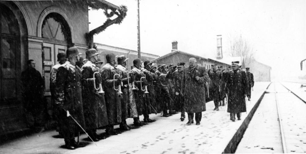 Krustpils-Jēkabpils dzelzceļa tilta atklāšanas pasākums. Latvijas Valsts un Ministru prezidents Kārlis Ulmanis apstaigā Latgales artilērijas pulka goda sardzes ierindu pie Krustpils dzelzceļa stacijas.