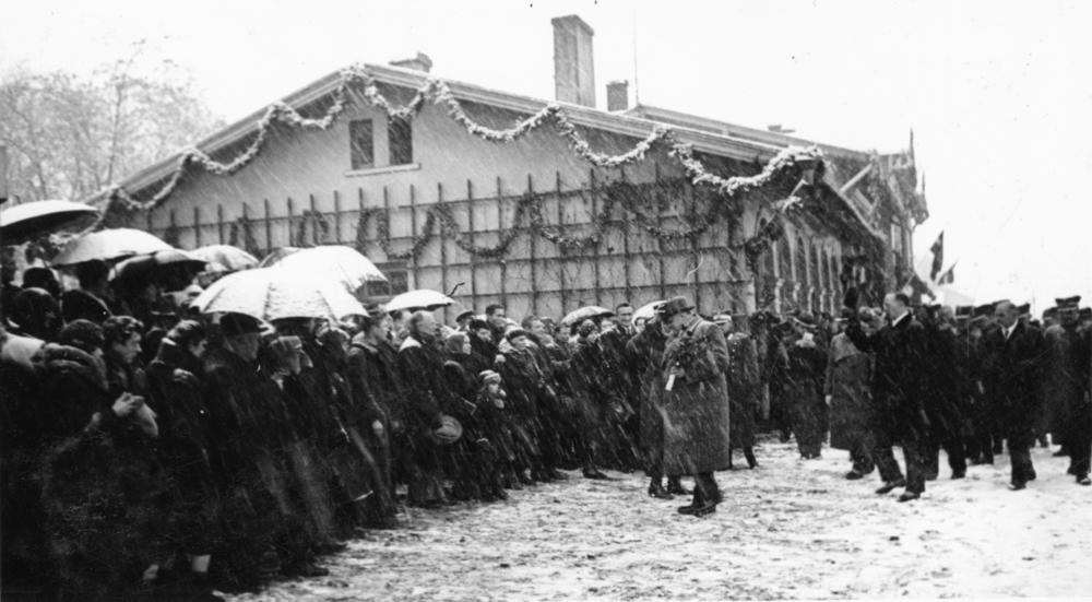 Krustpils-Jēkabpils dzelzceļa tilta atklāšanas pasākums. Latvijas Valsts un Ministru prezidents Kārlis Ulmanis sveic pie Krustpils dzelzceļa stacijas sapulcējušos iedzīvotājus.
